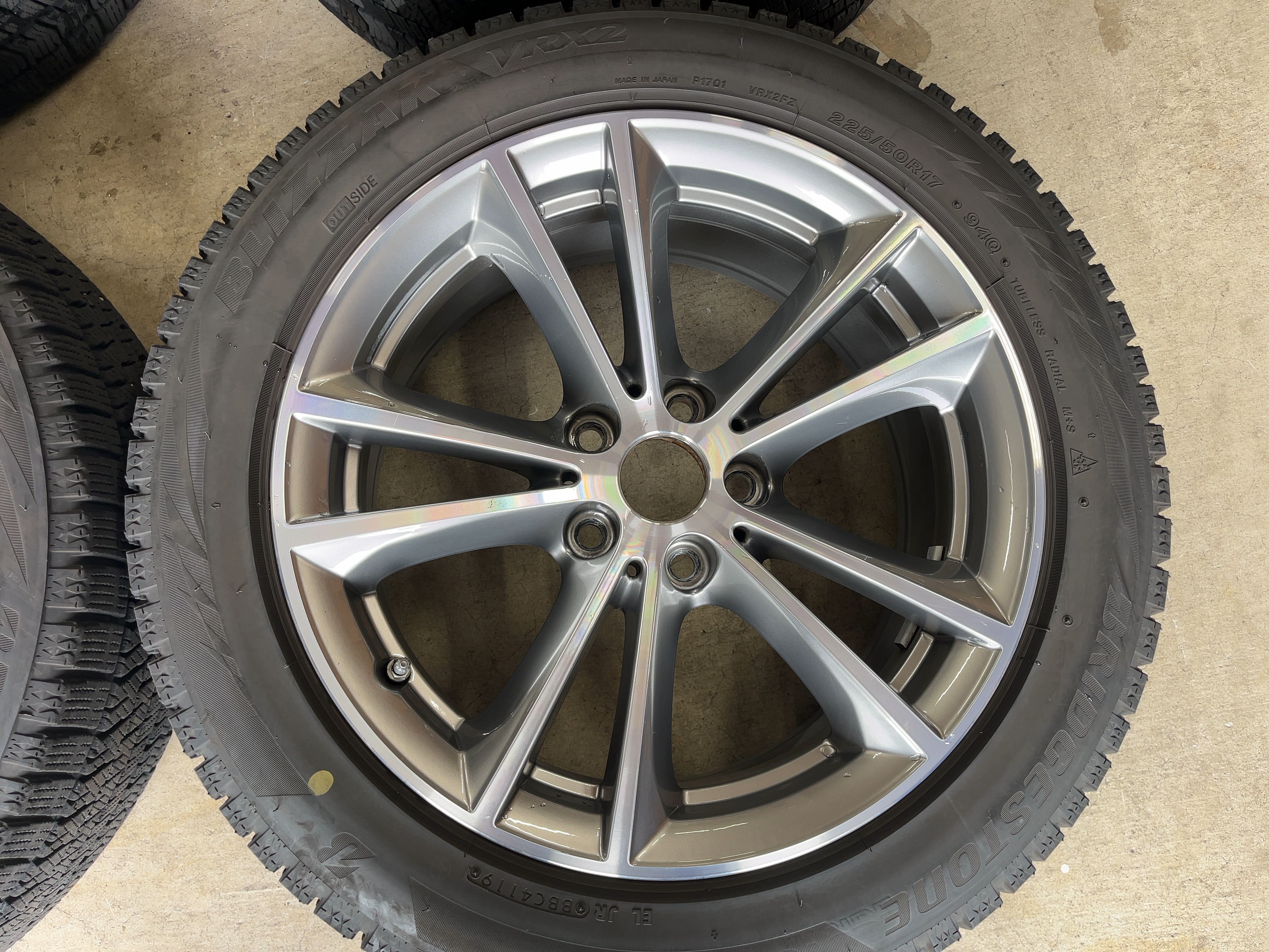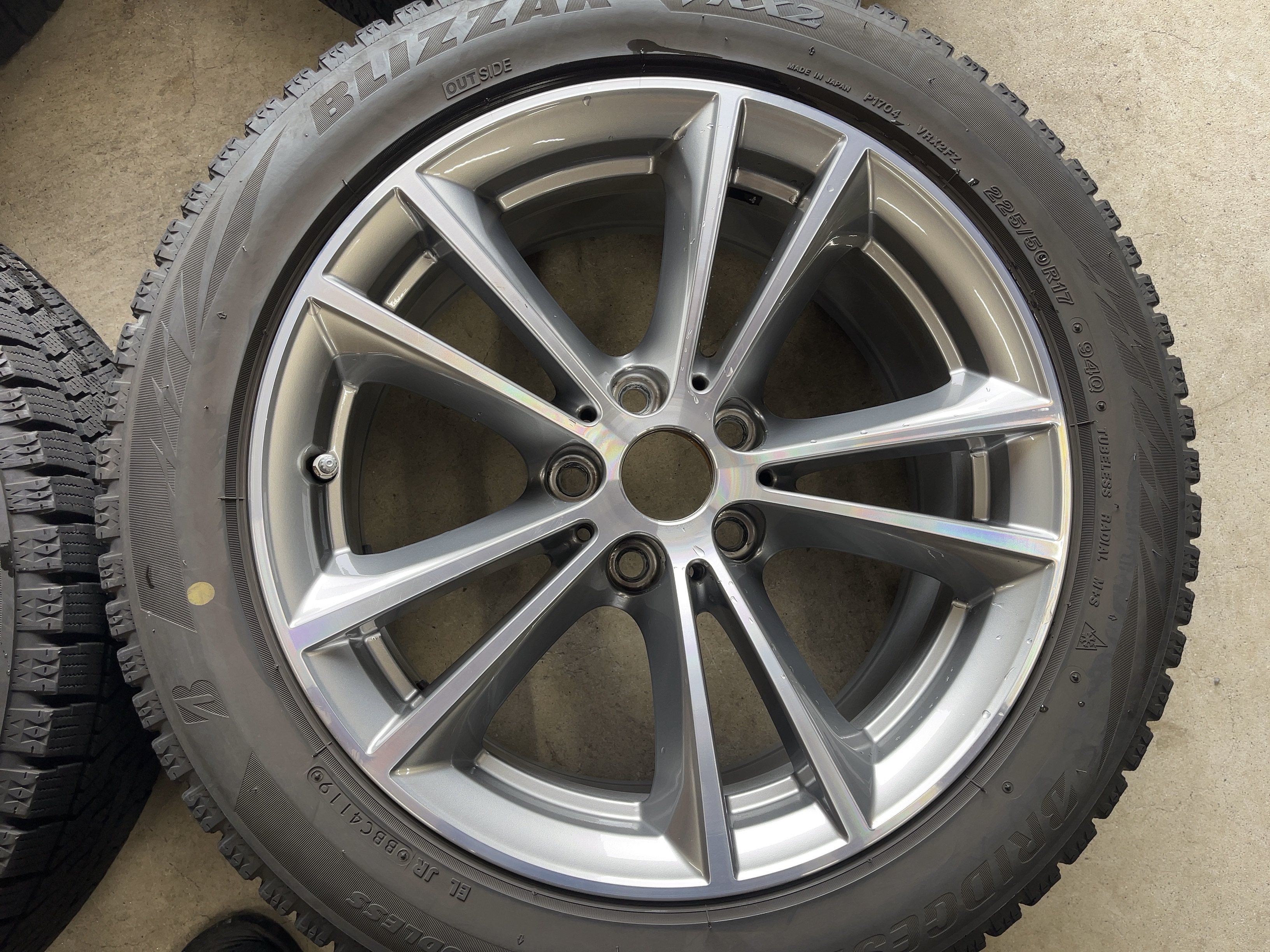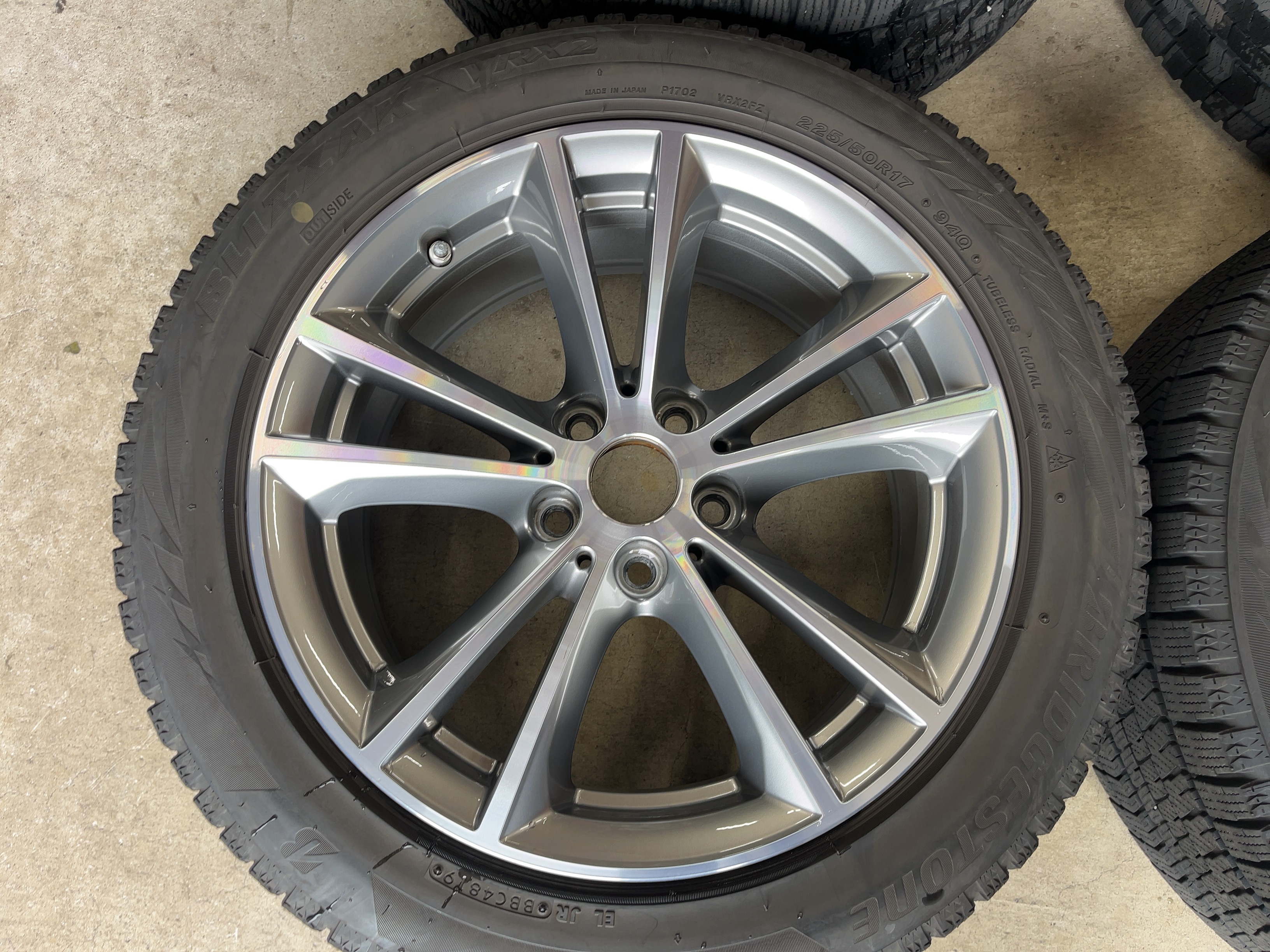 | アルミサイズ | ホイル 7.5J×17 オフセット+27 PCD 112 ハブ径 66.6 タイヤ BS ブリザック VRX2 225/50/17 4部山 2019年製 |