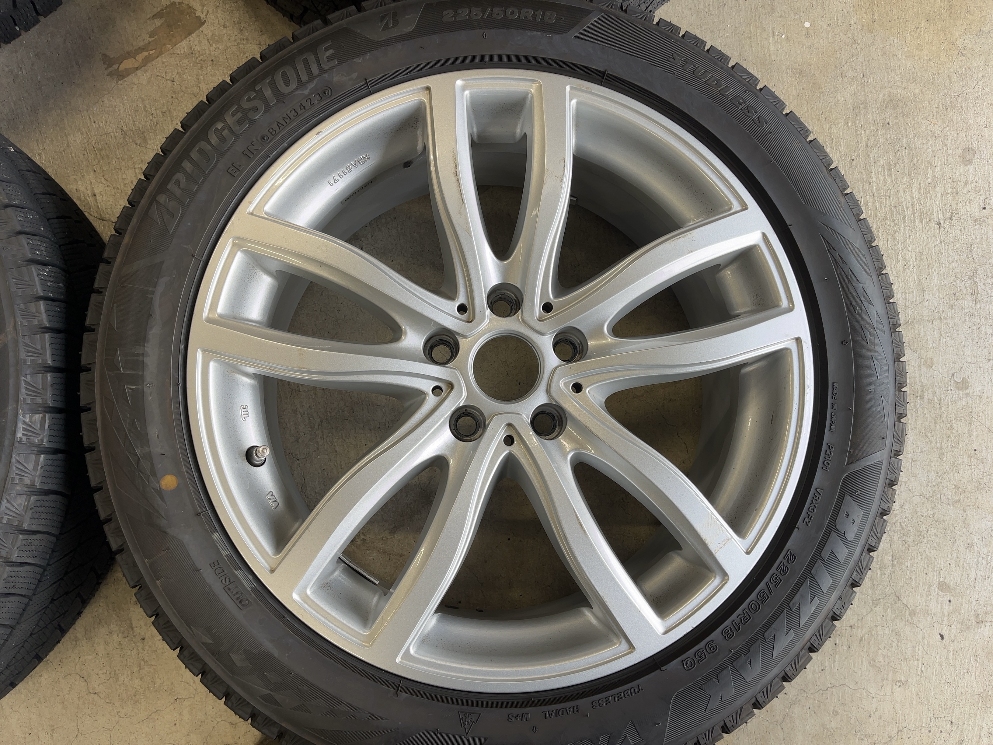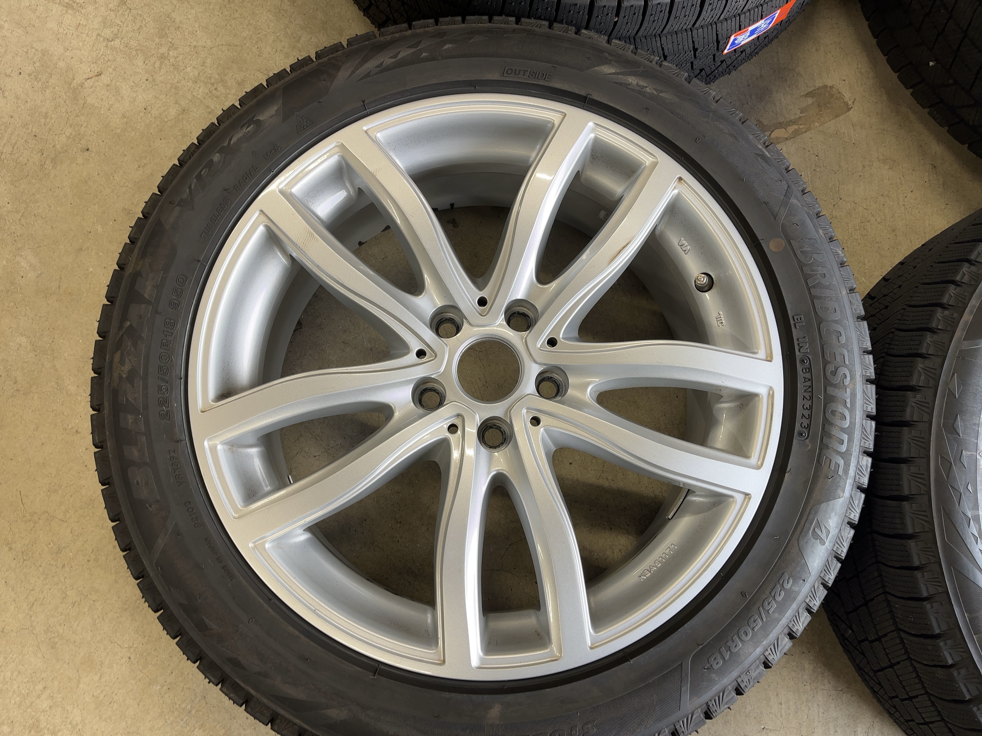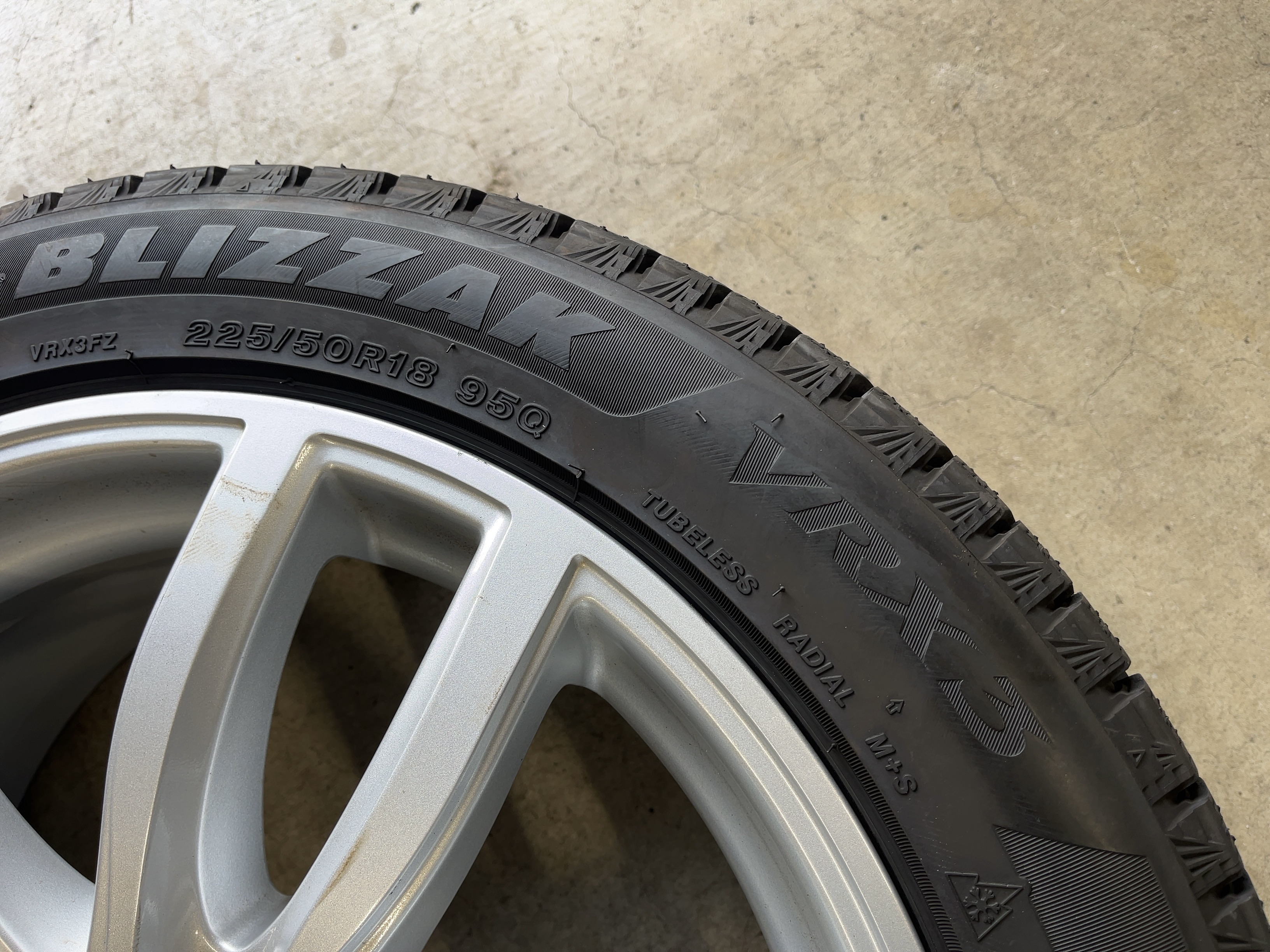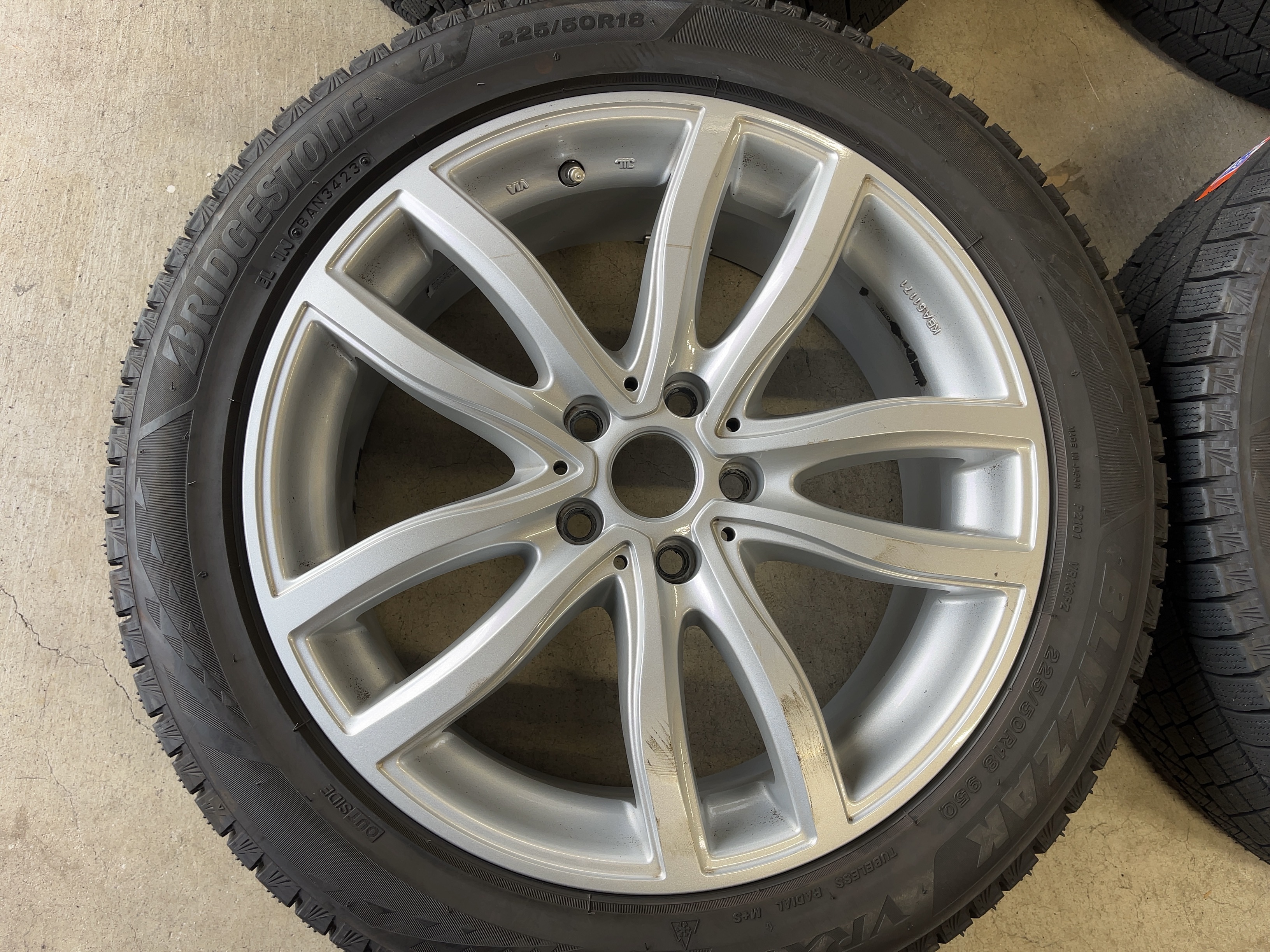 | アルミサイズ | ホイル 7.5J×18 オフセット+51 PCD 112 ハブ径 66.6 タイヤ BS ブリザック VRX3 225/50/18 9部山 2023年製 |